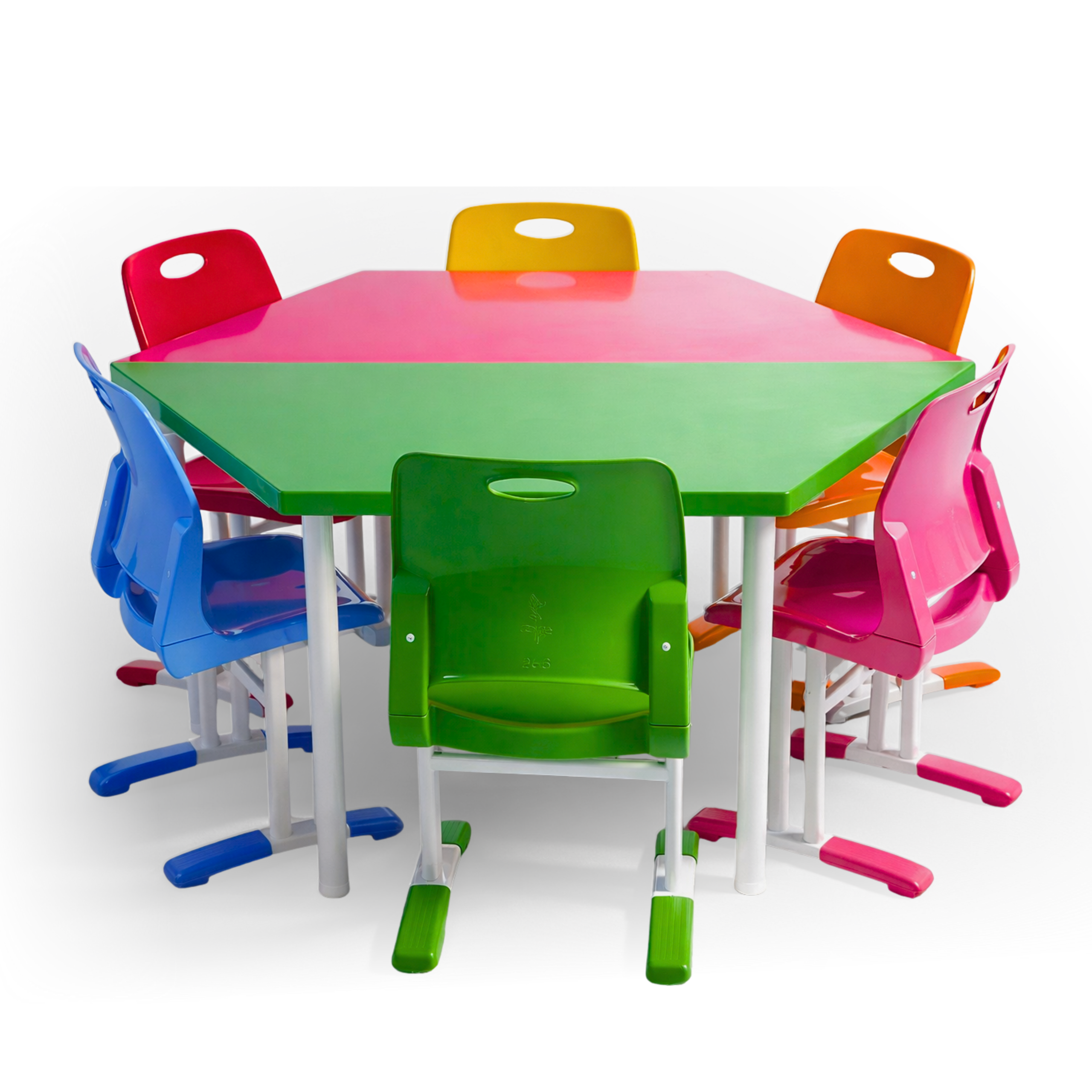 O conjunto hexagonal traz uma dualidade de cor em seu tampo, trazendo opções para sua biblioteca e sala de aula.
